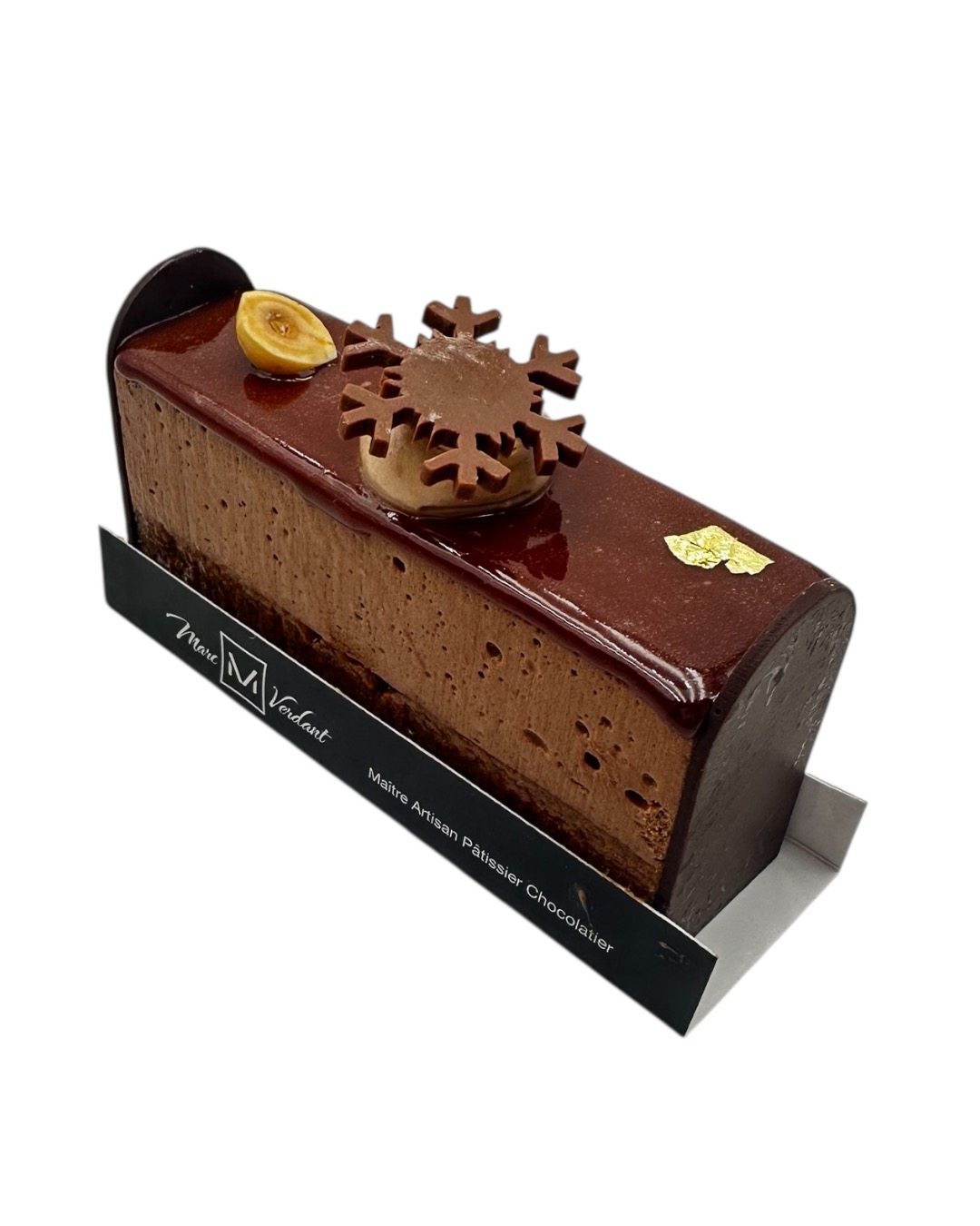 Elle révèle une mousse chocolat noir intense, profonde et enveloppante, qui impose d’emblée une élégance généreuse et parfaitement équilibrée. En son centre, un praliné croustillant au croquant irrésistible apporte relief, richesse et texture, rappelant le craquement des noisettes fraîchement cueillies.