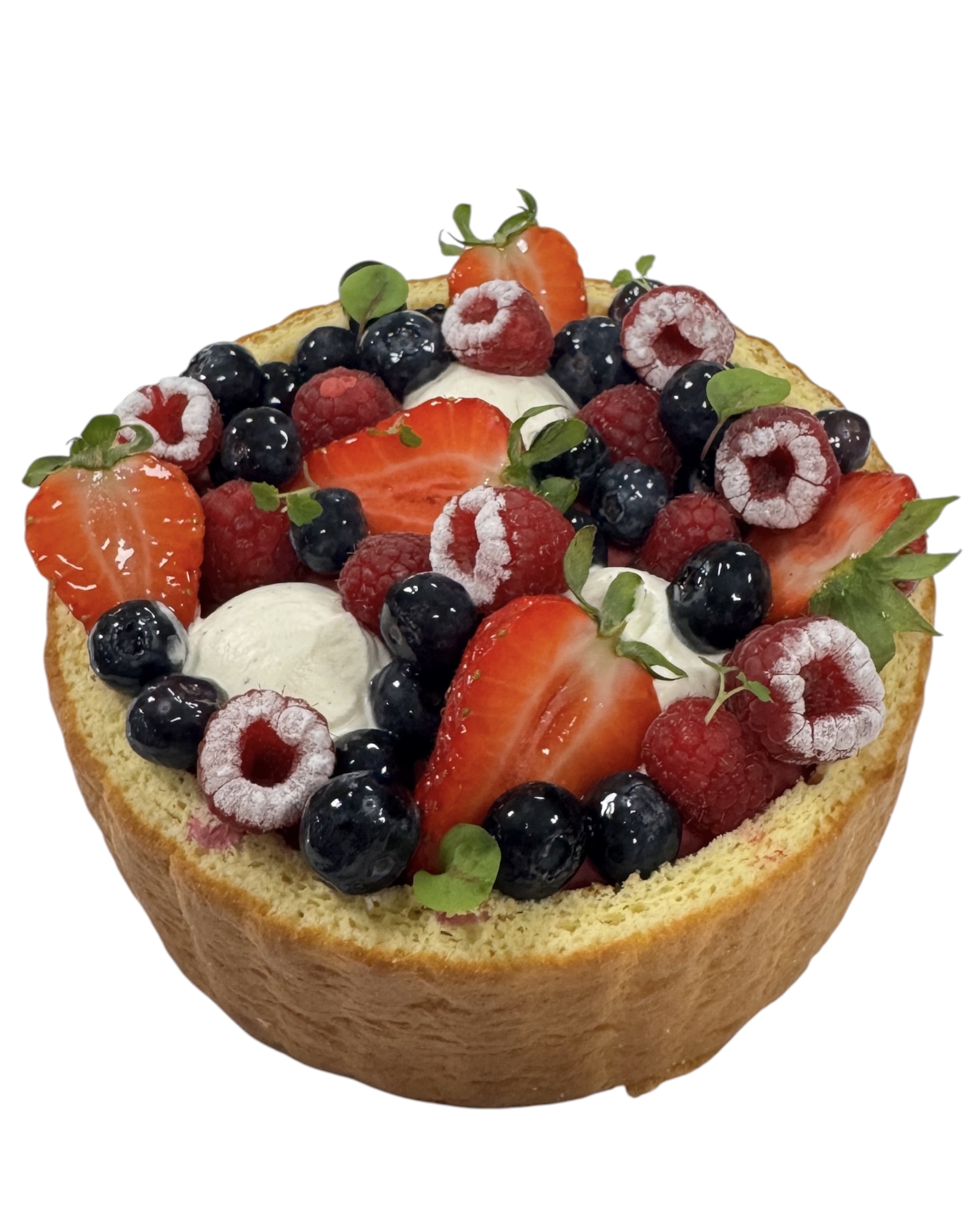 Framboise, Sucre, Blancs d’oeufs, Fraise, Crème de lait pasteurisée, Farine de blé, Jaune d’oeuf, Myrtille, Mûre, Eau, Blanc d’oeuf en poudre, Sucre inverti, Gelatine de boeuf, Beurre de cacao, Lait entier en poudre, Sirop de Glucose, lecithine de soja, , Gelifiant : Pectine de fruit E440, Extrait naturel de vanille, Acide citrique E330.
