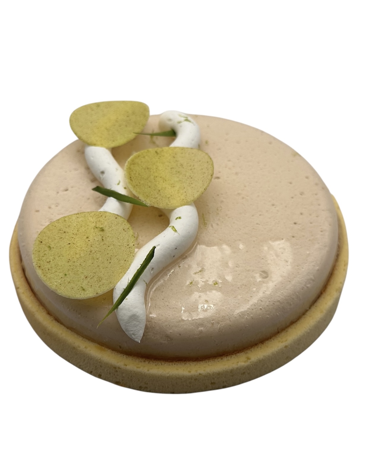 Maé est un entremets aux notes fruitées, composé d’une mousse poire banane, d’un insert mangue passion aux graines de chia, d’un biscuit moelleux et d’un sablé vanille. Une création équilibrée, entre douceur et fraîcheur, portée par des textures délicates et une palette aromatique subtile.