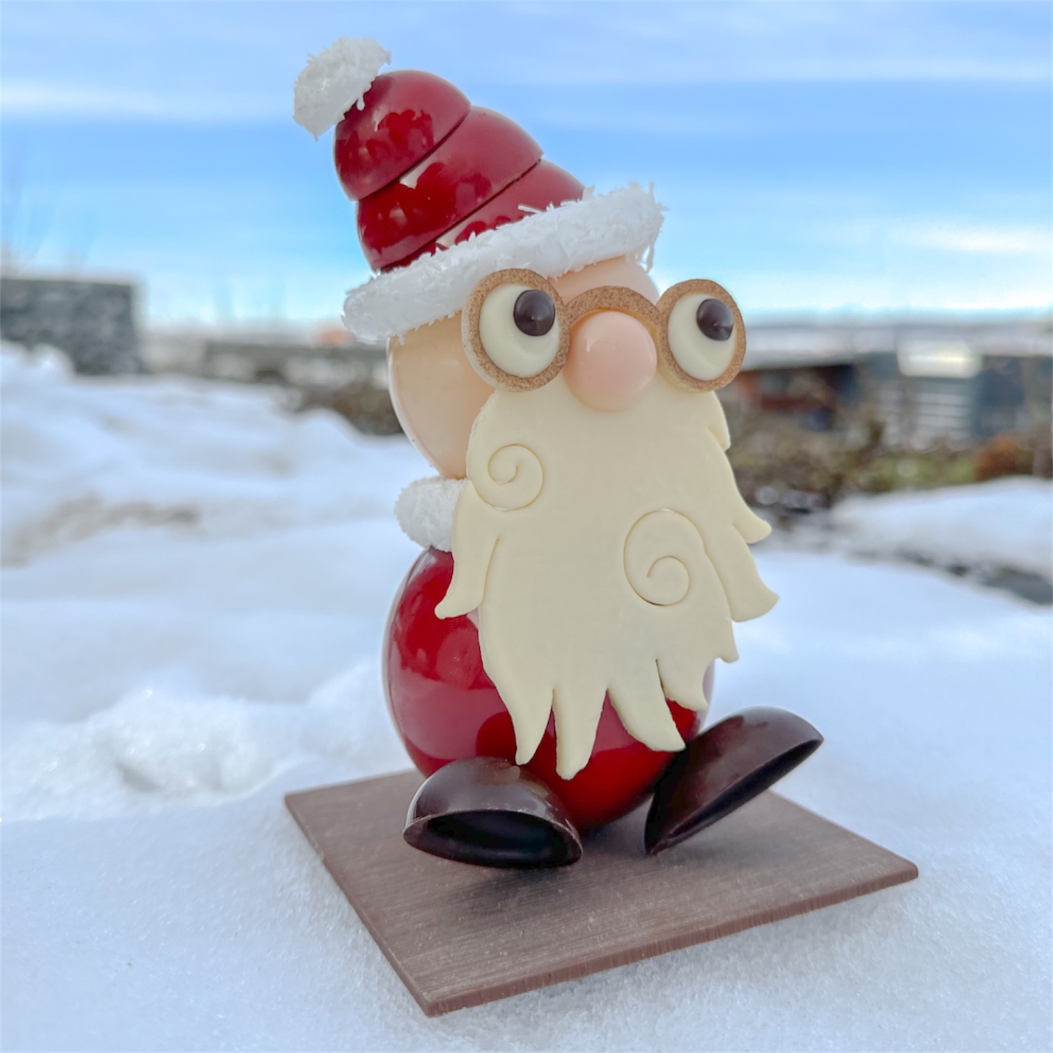 Son bonnet rouge brillant est décoré d’un pompon et d’une bande en guimauve moelleuse, délicatement enrobés de noix de coco râpée pour une touche festive et enneigée. Les détails minutieux, comme la barbe en chocolat blanc sculptée, les lunettes croquantes et les bottines en chocolat noir, font de cette pièce un véritable objet d’art gourmand.