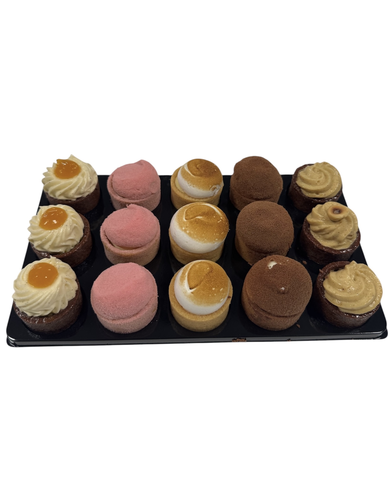 Un plateau de 15 mignardises sucrées aux saveurs variées : citron, framboise, chocolat, praliné et exotiques. Un assortiment délicat aux textures et parfums équilibrés, idéal pour accompagner un moment de partage tout en gourmandise.